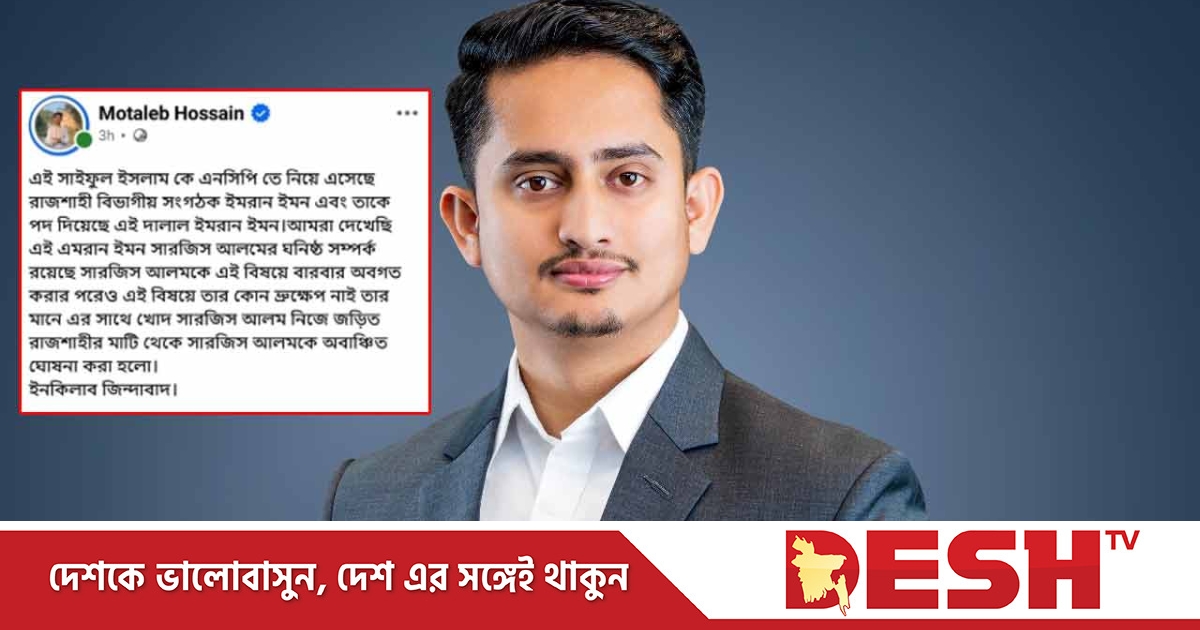 মোতালেব হোসেন তার ফেসবুকে লেখেন, ‘সাইফুল ইসলামকে এনসিপিতে এনেছে রাজশাহী বিভাগীয় সংগঠক ইমরান ইমন এবং তিনিই তাকে পদ দিয়েছেন। আমরা দেখেছি, ইমরান ইমনের সঙ্গে সারজিস আলমের ঘনিষ্ঠ সম্পর্ক রয়েছে। অনেকবার বিষয়টি জানালেও সারজিস আলম কোনো ব্যবস্থা নেননি। এর মানে তিনিও জড়িত।’