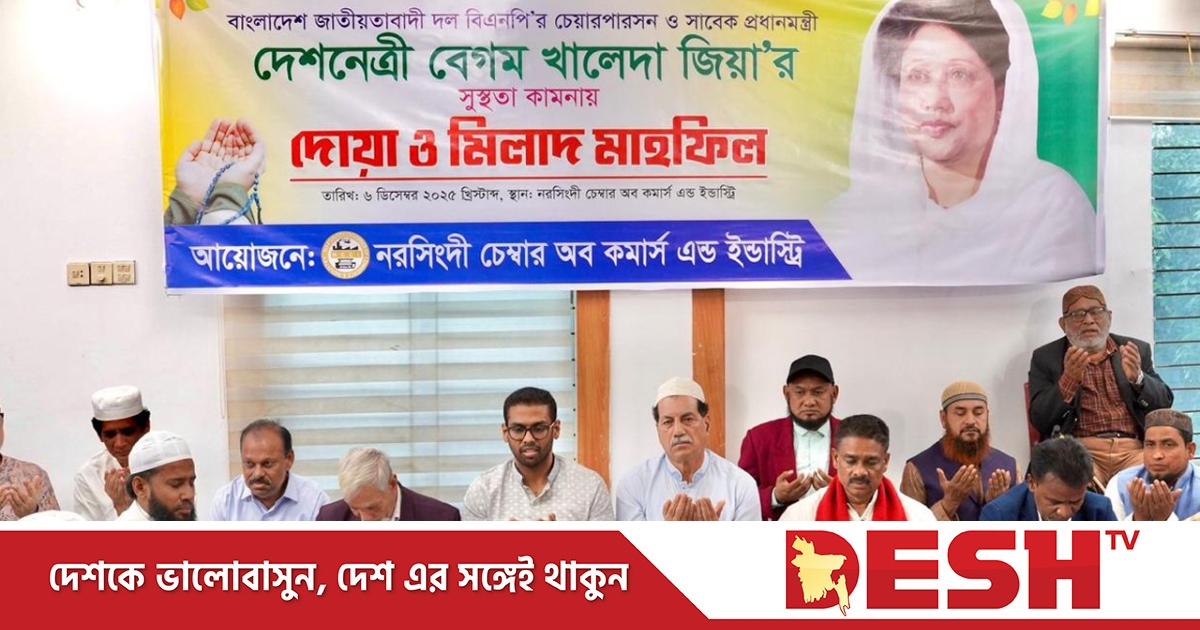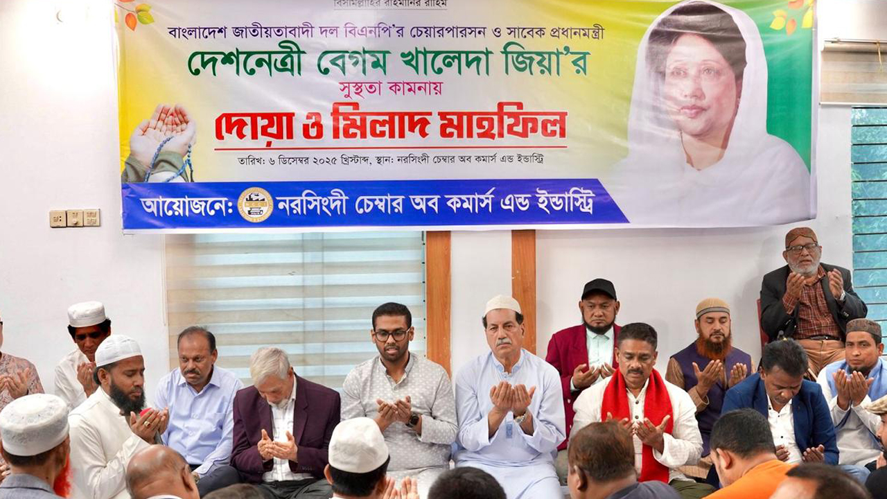 শনিবার (৬ ডিসেম্বর) বিকালে নরসিংদী চেম্বার অব কমার্স অ্যান্ড ইন্ডাস্ট্রির উদ্যোগে চেম্বারের মিলনায়তনে বিএনপির চেয়ারপারসন ও সাবেক প্রধানমন্ত্রী খালেদা জিয়ার সুস্থতা কামনায় দোয়া ও মিলাদ মাহফিলে প্রধান অতিথির বক্তব্যে তিনি এসব কথা বলেন।