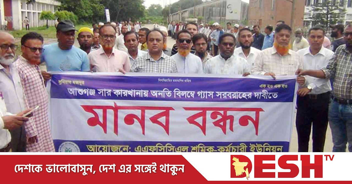 ব্রাহ্মণবাড়িয়ার আশুগঞ্জ সার কারখানায় অবিলম্বে গ্যাস সরবরাহের দাবিতে মানববন্ধন ও প্রতিবাদ সমাবেশ করেছেন শ্রমিক-কর্মচারীরা। এছাড়া তিন দিনের মধ্যে গ্যাস সরবরাহ না করা হলে কঠোর আন্দোলনেরও হুঁশিয়ারি দেন তারা।