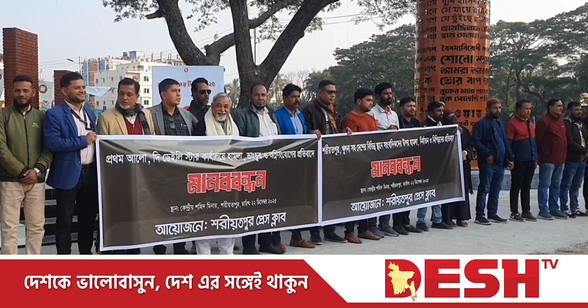 সোমবার (২২ ডিসেম্বর) বিকেল সাড়ে ৩টার দিকে শরীয়তপুর কেন্দ্রীয় শহীদ মিনার চত্ত্বরে ‘শরীয়তপুর প্রেসক্লাব’ এ মানববন্ধনের আয়োজন করে। এ সময় ঘটনার সঙ্গে জড়িত ব্যক্তিদের দ্রুত গ্রেপ্তার ও দৃষ্টান্তমূলক শাস্তির দাবি করেন জেলায় কর্মরত সংবাদকর্মীরা।