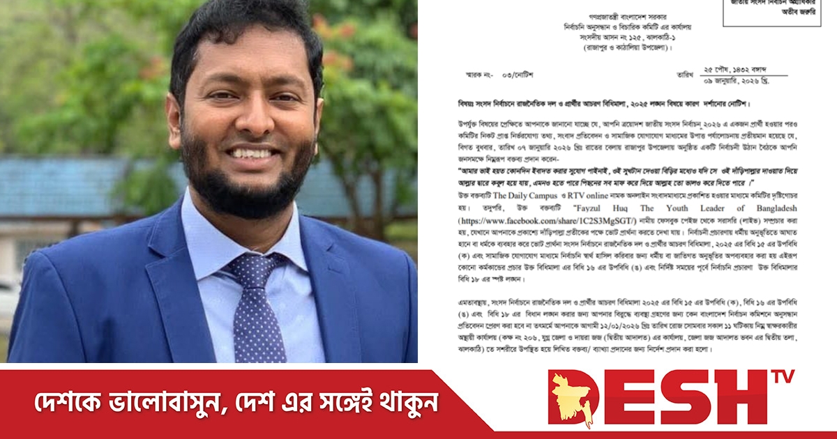 এছাড়া ‘Fayzul Huq The Youth Leader of Bangladesh” নামের একটি ফেসবুক পেজ থেকে সরাসরি (লাইভ) সম্প্রচারিত ওই ভিডিওতে তাকে প্রকাশ্যে দাঁড়িপাল্লা প্রতীকের পক্ষে ভোট প্রার্থনা করতে দেখা যায়। নোটিশে উল্লেখ করা হয়, নির্বাচনী প্রচারণায় ধর্মীয় অনুভূতিতে আঘাত হানা বা ধর্মকে ব্যবহার করে ভোট প্রার্থনা করা সংসদ নির্বাচনে রাজনৈতিক দল ও প্রার্থীর আচরণ বিধিমালা, ২০২৫-এর বিধি ১৫-এর উপবিধি (ক)-এর লঙ্ঘন। একই সঙ্গে সামাজিক যোগাযোগ মাধ্যমে নির্বাচনী স্বার্থ হাসিলের জন্য ধর্মীয় ও জাতিগত অনুভূতির অপব্যবহার বিধি ১৬-এর উপবিধি (ঙ) এবং নির্দিষ্ট সময়ের পূর্বে নির্বাচনী প্রচারণা চালানো বিধি ১৮-এর স্পষ্ট লঙ্ঘন বলে উল্লেখ করা হয়।
