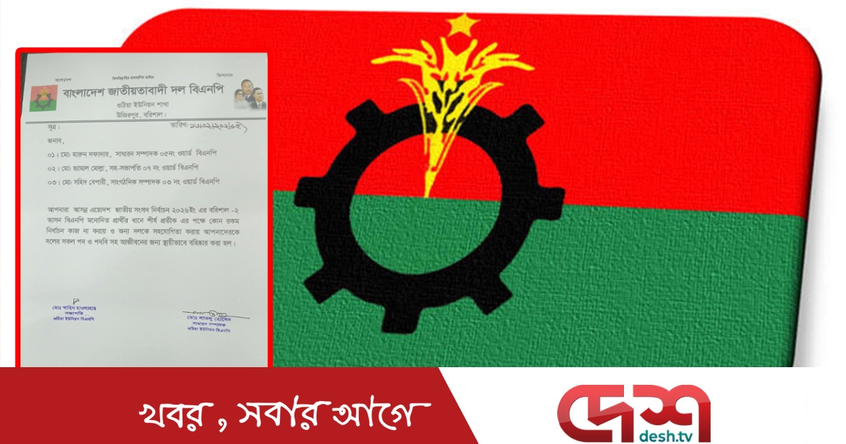 বরিশালের উজিরপুর উপজেলার গুঠিয়া ইউনিয়ন বিএনপির সভাপতি মো. শাহিন হাওলাদার ও সাধারণ সম্পাদক মো. লাভলু হোসেনের স্বাক্ষরিত ওই বিজ্ঞপ্তিতে জানা গেছে, এয়োদশ জাতীয় সংসদ নির্বাচনে বরিশাল-২ (উজিরপুর ও বানারীপাড়া) আসনে বিএনপি মনোনীত ধানের শীষ মার্কার প্রার্থীর পক্ষে কোনো রকম নির্বাচনী কাজ না করায় এবং প্রতিদ্বন্ধি অন্য দলকে সহযোগিতা করায় বিএনপির সকল পদ ও পদবিসহ আজীবনের জন্য তিন বিএনপি নেতাকে স্থায়ীভাবে বহিষ্কার করা হল।