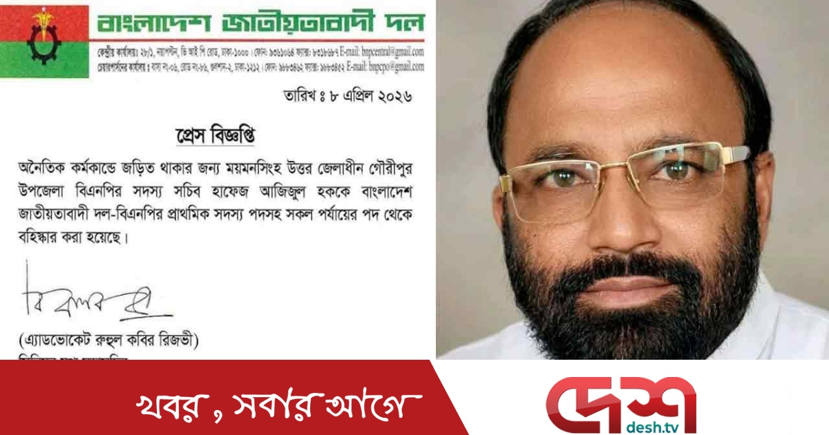 বাংলাদেশ জাতীয়তাবাদী দল (বিএনপি)-এর সিনিয়র যুগ্ম মহাসচিব রুহুল কবীর রিজভী স্বাক্ষরিত এক বিজ্ঞপ্তিতে জানানো হয়, অনৈতিক কর্মকাণ্ডে জড়িত থাকার অভিযোগে গৌরীপুর উপজেলা বিএনপির সদস্য সচিব হাফেজ আজিজুল হক-কে দলের প্রাথমিক সদস্যপদসহ সব পর্যায়ের পদ থেকে বহিষ্কার করা হয়েছে।