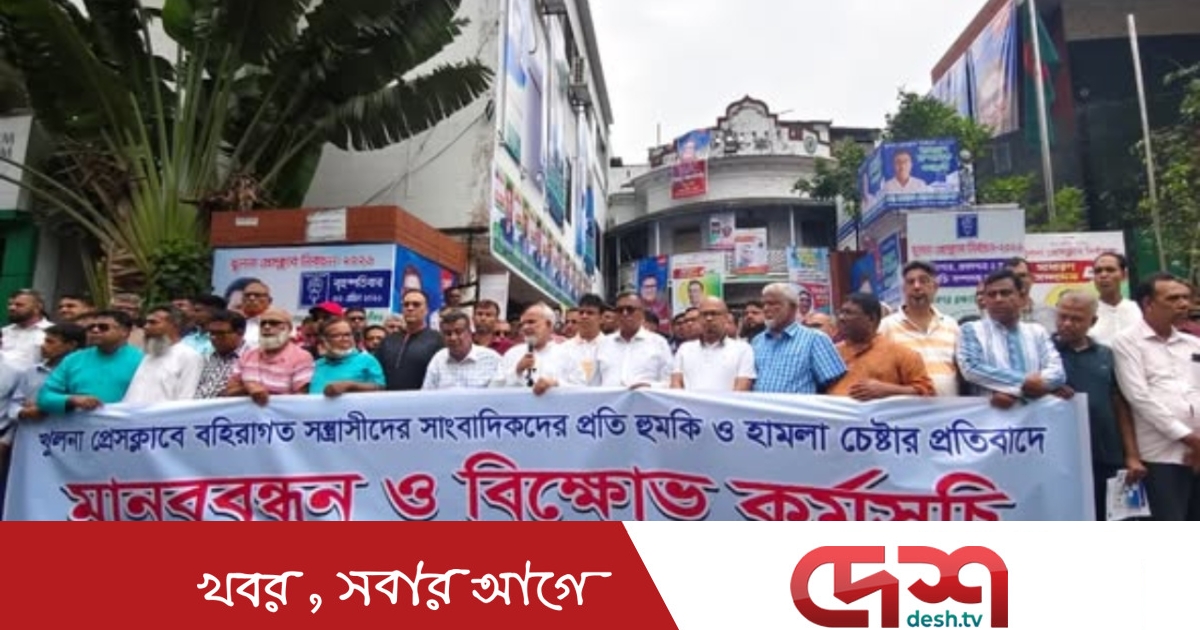 খুলনা প্রেসক্লাবে ঢুকে সাংবাদিকদের ওপর বহিরাগতদের হামলার প্রতিবাদে এবং হামলাকারীদের গ্রেপ্তার ও বিচারের দাবিতে মানববন্ধন ও বিক্ষোভ সমাবেশ অনুষ্ঠিত হয়েছে। সোমবার দুপুরে প্রেস ক্লাবের সামনে সড়কে অবস্থান নিয়ে সাংবাদিকরা এ কর্মসূচি পালন করেন।