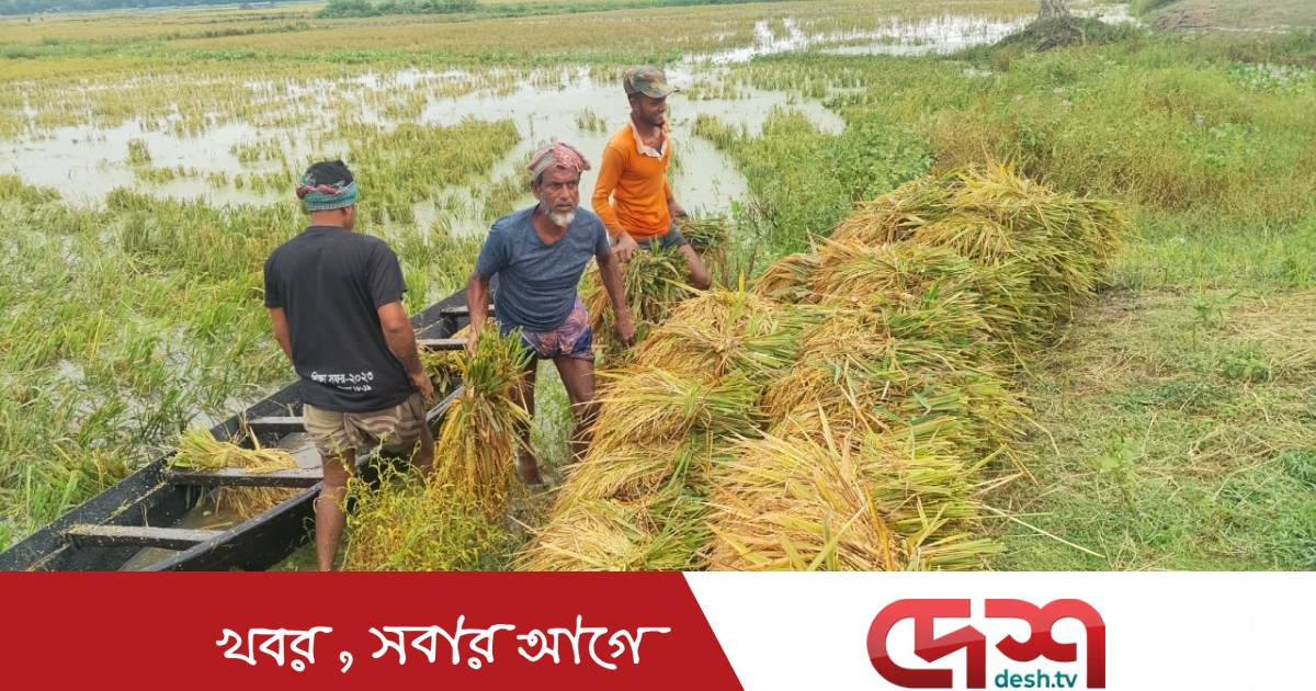 স্থানীয় বেজগাতী গ্রামের কৃষক শাহজাহান মিয়া বলেন, ‘কয়েক একর জমিতে বোরো আবাদ করেছি। কিন্তু জমিতে পানি উঠে ধান তলিয়ে যাচ্ছে। মেশিন পাচ্ছি না, শ্রমিকও পাচ্ছি না। বাধ্য হয়ে নিজেরাই পানিতে নেমে ধান কেটে নৌকায় তুলছি।’