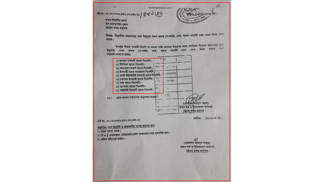 নিষেধাজ্ঞায় এসব ব্যাংকের পে-অর্ডার, চেক ও ব্যাংক গ্যারান্টি না নেওয়ার কথা জানানো হয়েছে।