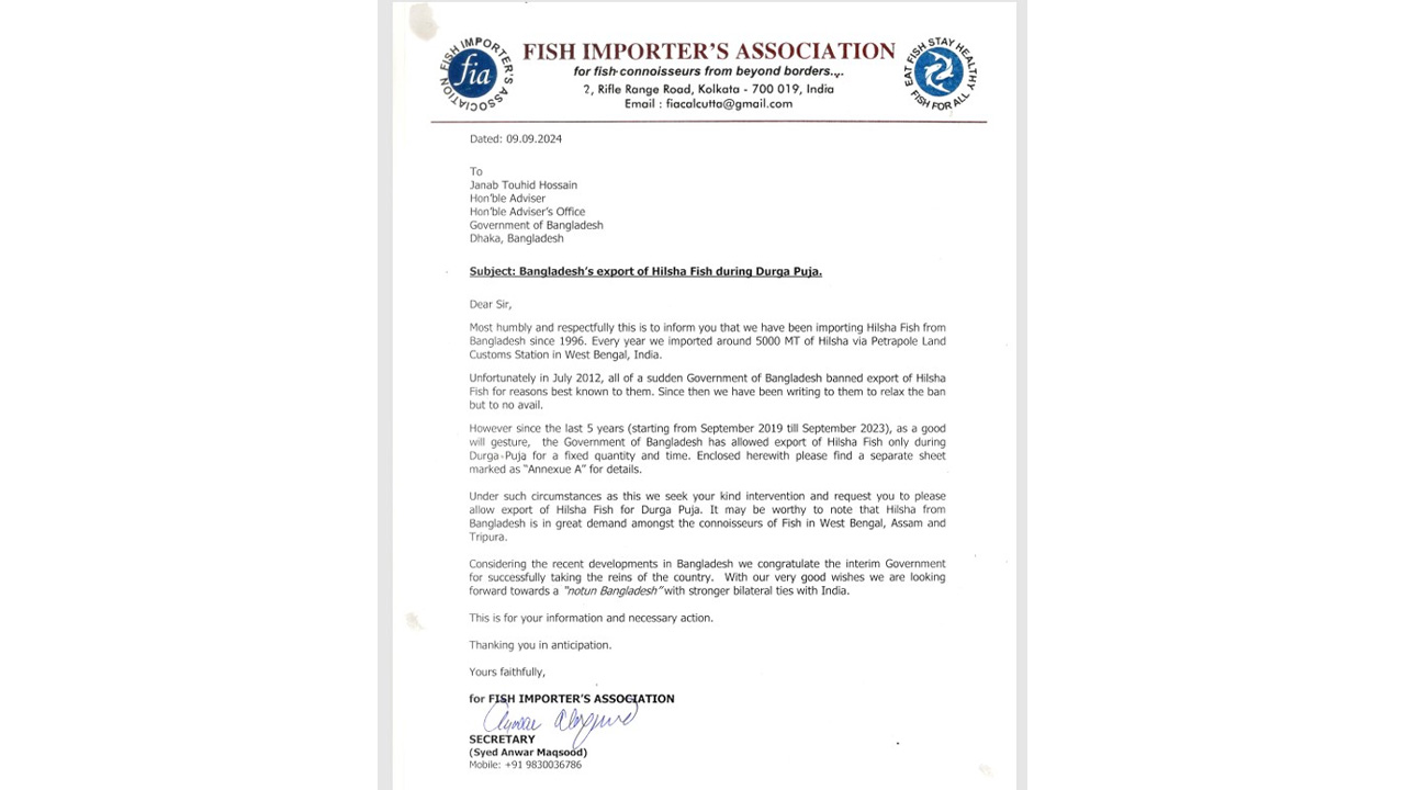 চিঠিতে বলা হয়, এমন পরিস্থিতিতে আমরা আপনার (পররাষ্ট্র উপদেষ্টা) সদয় হস্তক্ষেপ কামনা করছি এবং দুর্গাপূজার জন্য ইলিশ মাছ রপ্তানির অনুমতি দেয়ার জন্য অনুরোধ করছি। কারণ পশ্চিমবঙ্গ, আসাম এবং ত্রিপুরায় বাংলাদেশের ইলিশের প্রচুর চাহিদা রয়েছে।
