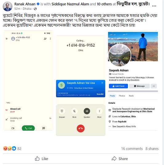 এরই ধারাবাহিকতায় এবার হত্যার হুমকি পেলেন বুয়েটে প্রগতিশীল রাজনীতির কর্মী রনক হাসান।