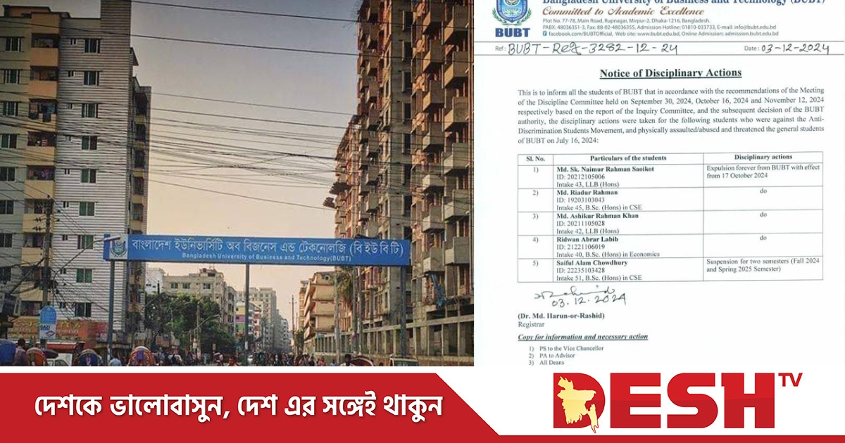 জুলাই-আগস্টের বিপ্লব চলাকালীন বাংলাদেশ ইউনিভার্সিটি অব বিজনেস অ্যান্ড টেকনোলজির (বিইউবিটি) সাধারণ শিক্ষার্থীদের হুমকি প্রদান এবং শারীরিকভাবে নির্যাতনকারী নিষিদ্ধ ঘোষিত ছাত্রলীগের পাঁচ নেতাকে বিভিন্ন মেয়াদে বহিষ্কার করেছে বিইউবিটি কর্তৃপক্ষ।