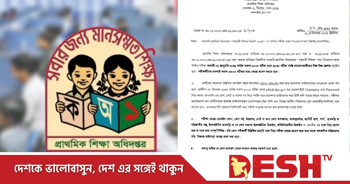 অধিদপ্তর জানিয়েছে, পূর্বনির্ধারিত সময়সূচি অনুযায়ী আগামী ২ জানুয়ারি (শুক্রবার) দেশজুড়ে একযোগে এই পরীক্ষা অনুষ্ঠিত হবে। বিভ্রান্তি এড়াতে শনিবার (২৭ ডিসেম্বর) থেকেই শুরু হয়েছে প্রবেশপত্র ডাউনলোডের প্রক্রিয়া।