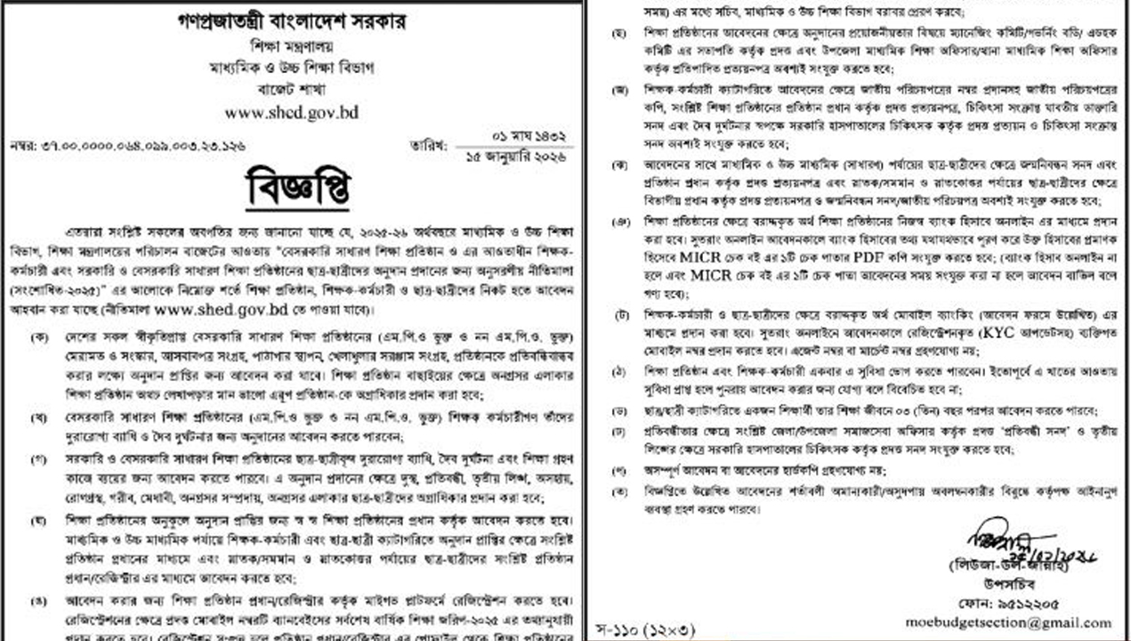 এতে বলা হয়েছে, ২০২৫-২৬ অর্থবছরে মাধ্যমিক ও উচ্চ শিক্ষা বিভাগ, শিক্ষা মন্ত্রণালয়ের পরিচালন বাজেটের আওতায় ‘বেসরকারি সাধারণ শিক্ষাপ্রতিষ্ঠান ও এর আওতাধীন শিক্ষক-কর্মচারী এবং সরকারি ও বেসরকারি সাধারণ শিক্ষাপ্রতিষ্ঠানের ছাত্র-ছাত্রীদের অনুদান প্রদানের জন্য অনুসরণীয় নীতিমালা (সংশোধিত-২০২৫)’ এর আলোকে শিক্ষাপ্রতিষ্ঠান, শিক্ষক-কর্মচারী ও ছাত্র-ছাত্রীদের নিকট হতে আবেদন আহ্বান করা যাচ্ছে।