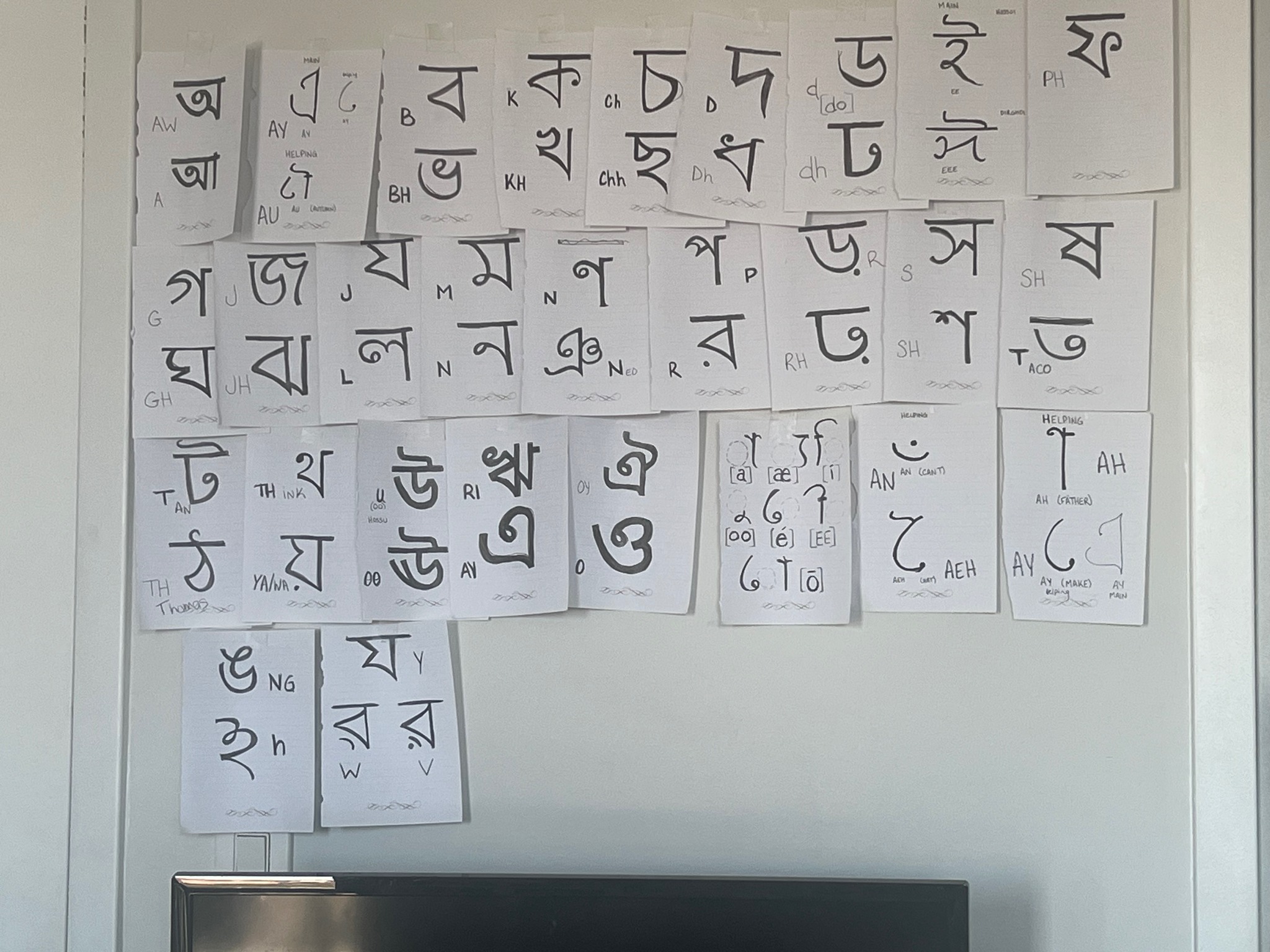 বাংলা স্বরবর্ণ ও ব্যঞ্জনবর্ণগুলো কাগজে লিখে দেয়ালে ঝুলিয়ে পাঠ নিচ্ছেন কোর্টনি কফি। সেটির একটি ছবিও তিনি সামাজিক মাধ্যমে প্রকাশ করেছেন। ক্যাপশনে লিখেছেন, আমি শিখছি।