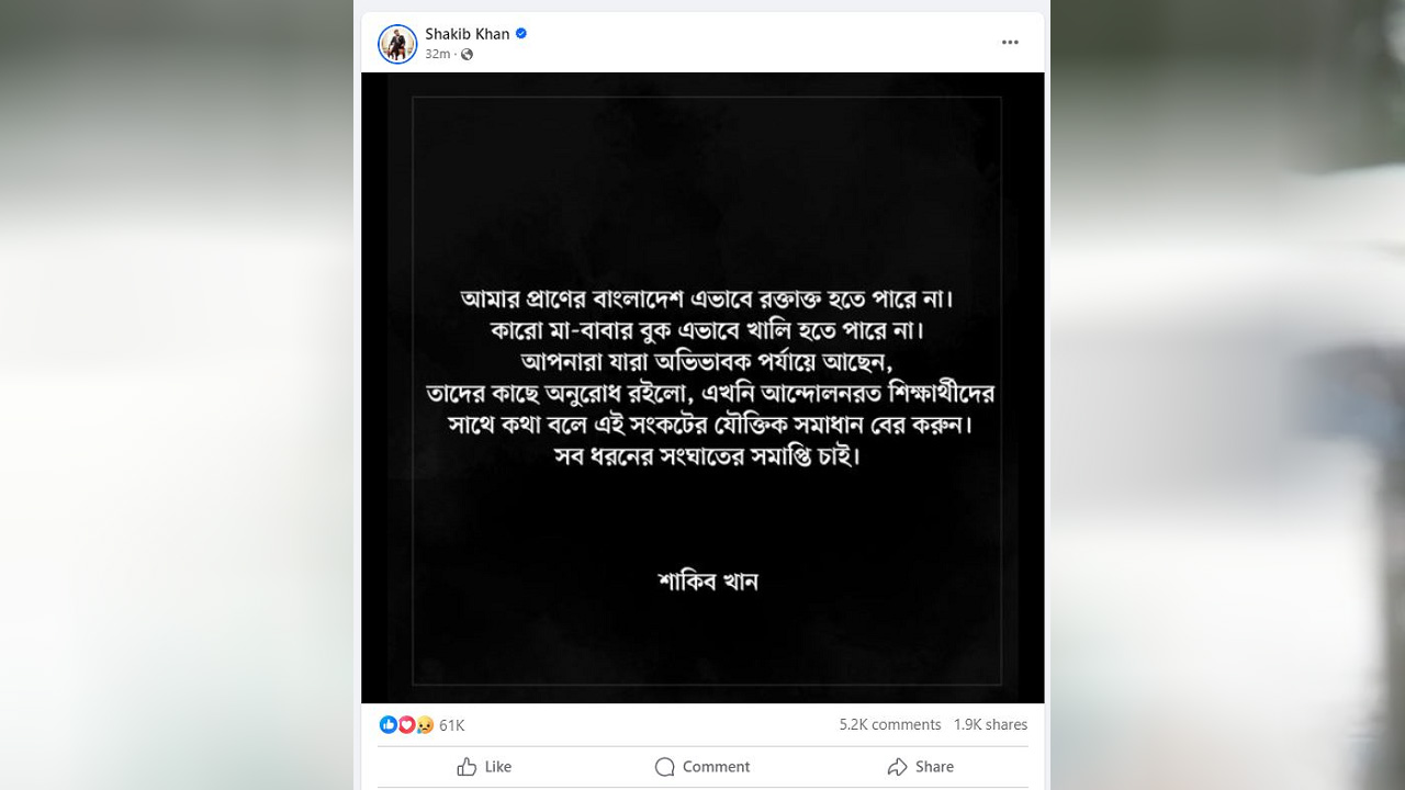 এক ফেসবুক পোস্টে শাকিব খান লিখেছেন, আমার প্রাণের বাংলাদেশ এভাবে রক্তাক্ত হতে পারে না। কারও মা-বাবার বুক এভাবে খালি হতে পারে না। আপনারা যারা অভিভাবক পর্যায়ে আছেন, তাদের কাছে অনুরোধ রইল, এখনই আন্দলতরত শিক্ষার্থীদের সঙ্গে কথা বলে এই সংকটের যৌক্তিক সমাধান বের করুন। সব ধরনের সংঘাতের সমাপ্তি চাই।