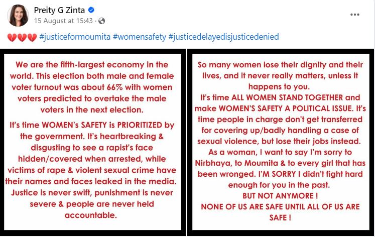 প্রীতি জিন্টা নারীদের সুরক্ষার দাবি করেছেন তার পোস্টে। তিনি ক্যাপশনে লিখেছেন, ‘অর্থনীতিতে সারা বিশ্বে আমাদের দেশ পঞ্চম স্থানে রয়েছে। আগামী নির্বাচনে পুরুষ ভোটারের সংখ্যা ছাপিয়ে যাবেন নারীরা, এমনই মনে করা হচ্ছে। সময় হয়েছে যে নারীদের নিরাপত্তাকেই সবার আগে রাখতে হবে। খারাপ লাগে যখন দেখি, গ্রেফতারের পরে একজন ধর্ষকের মুখ ঢাকা থাকে। কিন্তু নির্যাতিতার ছবি ও নাম সব প্রকাশ্যে আনা হয়।’