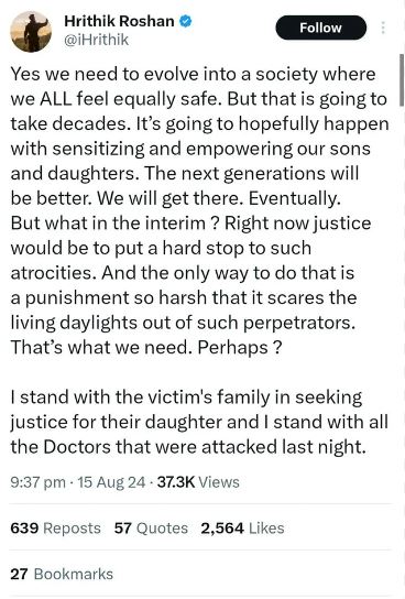 হৃত্বিক রোশন তার এক্স হ্যান্ডেলে লেখেন, "সমাজ হিসেবে আমাদের এবার বদলাতে হবে যাতে সবাই সেখানে নিরাপদ অনুভব করেন। কিন্তু এতে বহু সময় লেগে যাচ্ছে। আমাদের ছেলে মেয়েদের সঠিকভাবে মানুষ করলেই আশা করছি এই বদল আসবে। আমরা ঠিক পারব। কিন্তু এখন আপাতত এই ঘটনার দ্রুত বিচার চাই। আর সেই শাস্তি এতটাই কঠিন এবং দৃষ্টান্তমূলক হতে হবে, যাতে অপরাধীরা আর এই কাজ করার কথা না ভাবে। আমি নির্যাতিতার পরিবারের পাশে রইলাম, ওদের মেয়ের ন্যায় বিচার চাই।"