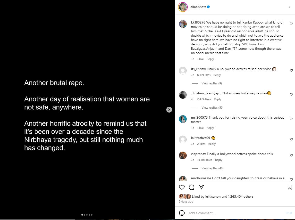 এই ঘটনার তীব্র নিন্দা করে আলিয়া ভাট লেখেন, "আরও একটা ধর্ষণ, বুঝলাম মেয়েরা কোথাও সুরক্ষিত নয়। এক দশক আগে নিভয়াকান্ড নাড়া দিয়ে গিয়েছিল। আবার একই ঘটনা, কিছুই বদলায়নি। আমরা কীভাবে আমাদের কর্মস্থলে যাব? এই চিন্তা মাথায় ঘুরছে। এই ঘটনা আরও একবার চোখে আঙুল দিয়ে দেখিয়ে দিল নারীদের সুরক্ষা আসলে তাদের নিজেদের হাতেই তুলে নিতে হবে।"
