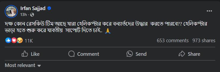 ইরফান সাজ্জাদ তার ফেসবুক পোস্টে লিখেছেন, ‘দক্ষ কোনো রেসকিউ টিম আছে যারা হেলিকপ্টার করে বন্যার্তদের উদ্ধার করতে পারবে? হেলিকপ্টার ভাড়া হতে শুরু করে যাবতীয় সাপোর্ট দিতে চাই।’