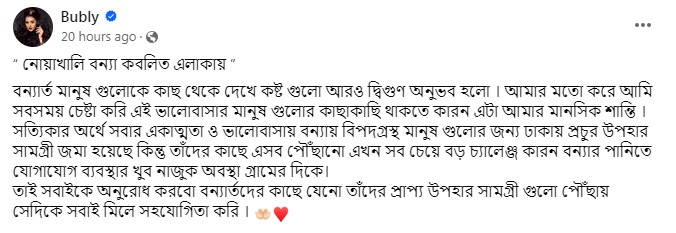 ১ মিনিট ১২ সেকেন্ডের ভিডিও পোস্ট করা স্থিরচিত্রের ক্যাপশনে বুবলী লিখেছেন, "বন্যার্ত মানুষগুলোকে কাছ থেকে দেখে কষ্টগুলো আরও দ্বিগুণ অনুভব হলো। আমার মতো করে আমি সবসময় চেষ্টা করি এই ভালোবাসার মানুষগুলোর কাছাকাছি থাকতে কারণ এটা আমার মানসিক শান্তি। সত্যিকার অর্থে সবার একাত্মতা ও ভালোবাসায় বন্যায় বিপদগ্রস্ত মানুষগুলোর জন্য ঢাকায় প্রচুর উপহার সামগ্রী জমা হয়েছে।"
