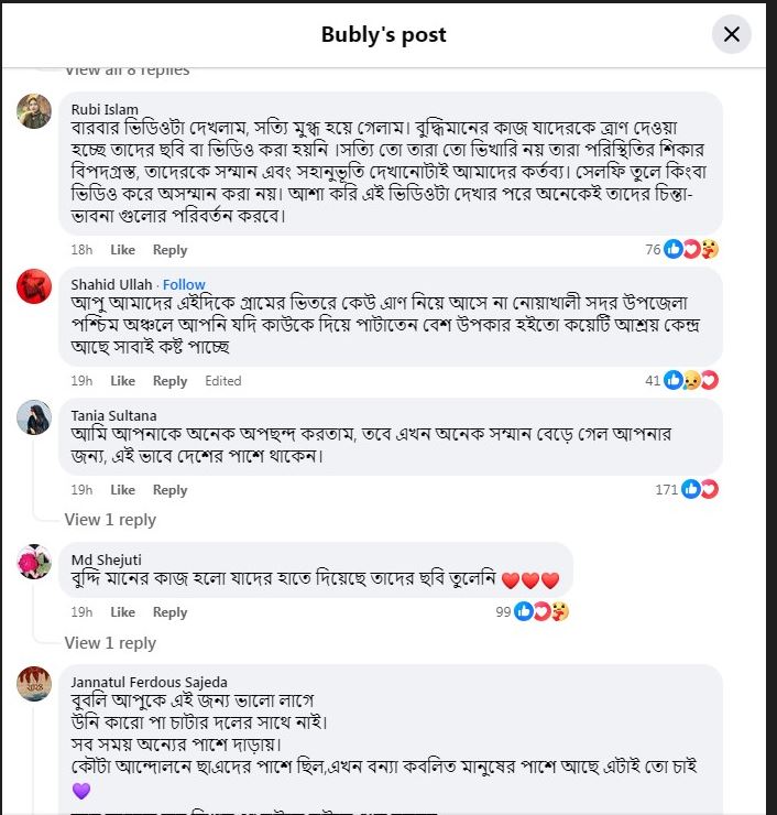 আবার এমন অনেকে আছেন যারা বুবলীকে অপছন্দ করতেন তারাও এখন পছন্দ করতে শুরু করেছেন। একজন লিখেছেন, আমি আপনাকে অনেক অপছন্দ করতাম, তবে এখন অনেক সম্মান বেড়ে গেল আপনার জন্য, এই ভাবে দেশের পাশে থাকেন। অন্যদিকে কেউ কেউ আবার কোথায় কোথায় ত্রাণ লাগবে এমন তথ্যও দিচ্ছেন অভিনেত্রীকে।