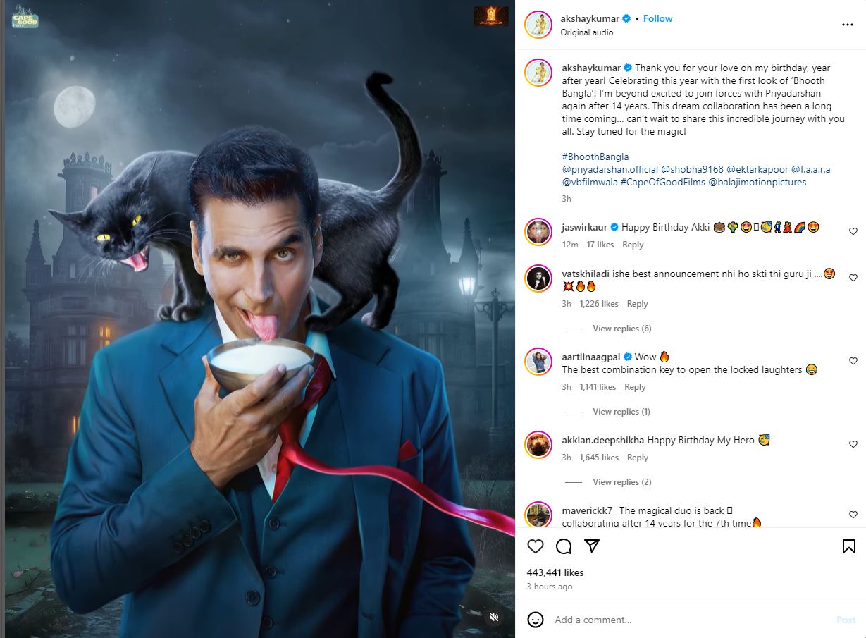 জন্মদিনে ভক্ত, অনুরাগীদের উদ্দেশে অক্ষয় লিখেছেন, “বছরের পর বছর আপনারা আমার জন্মদিনে যেভাবে ভালবাসা জানিয়েছেন তার জন্য ধন্যবাদ। এ বছরের জন্মদিন উদ্যাপন করছি আসন্ন সিনেমা ‘ভূত বাংলো’-র প্রথম ঝলক ভাগ করে। প্রায় ১৪ বছর পর প্রিয়দর্শনের সঙ্গে আবার কাজ করার জন্য আমি উৎসাহিত। দীর্ঘ অপেক্ষার পর শুরু হচ্ছে এই স্বপ্নের সিনেমা। আপনাদের সঙ্গে এই সফরের অভিজ্ঞতা ভাগ করে নেয়ার জন্য আমার আর তর সইছে না। জাদু কেমন হয়, তা জানার জন্য সঙ্গে থাকুন।”