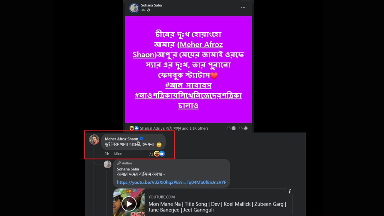 সেই পোস্টের কমেন্টবক্সে এসে মন্তব্য করেন অভিনেত্রী মেহের আফরোজ শাওন। যেখানে সোহানা সাবাকে উদ্দেশ্য করে তিনি লেখেন, আমার মেয়ে জামাইয়ের দিকে চোখ দিবি না, খবরদার!