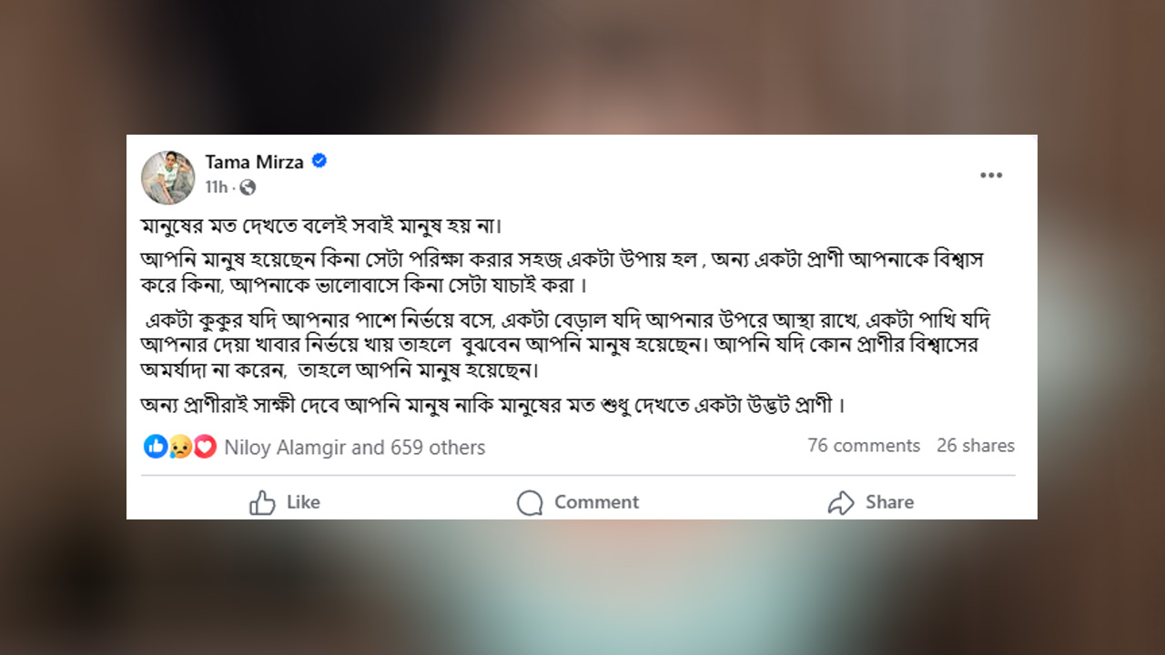 পোস্ট দিয়ে তমা লিখেছেন, ‘মানুষের মতো দেখতে বলেই সবাই মানুষ হয় না। আপনি মানুষ হয়েছেন কিনা সেটা পরিক্ষা করার সহজ একটা উপায় হল, অন্য একটা প্রাণী আপনাকে বিশ্বাস করে কিনা, আপনাকে ভালোবাসে কিনা সেটা যাচাই করা।’