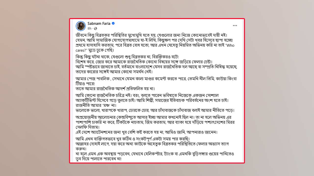 তিনি লিখেছেন, ‘বর্তমানে বাংলাদেশে যেসব রাজনৈতিক দল আছে বা সম্প্রতি নিষিদ্ধ হয়েছে, তাদের কারোর সঙ্গেই আমার কোনো সমর্থন নেই। আমার পেজ পাবলিক সেখানে নানা ধরনের মানুষ কমেন্ট করে, কিন্তু তাতে আমার রাজনৈতিক আদর্শ প্রতিফলিত হয় না।’