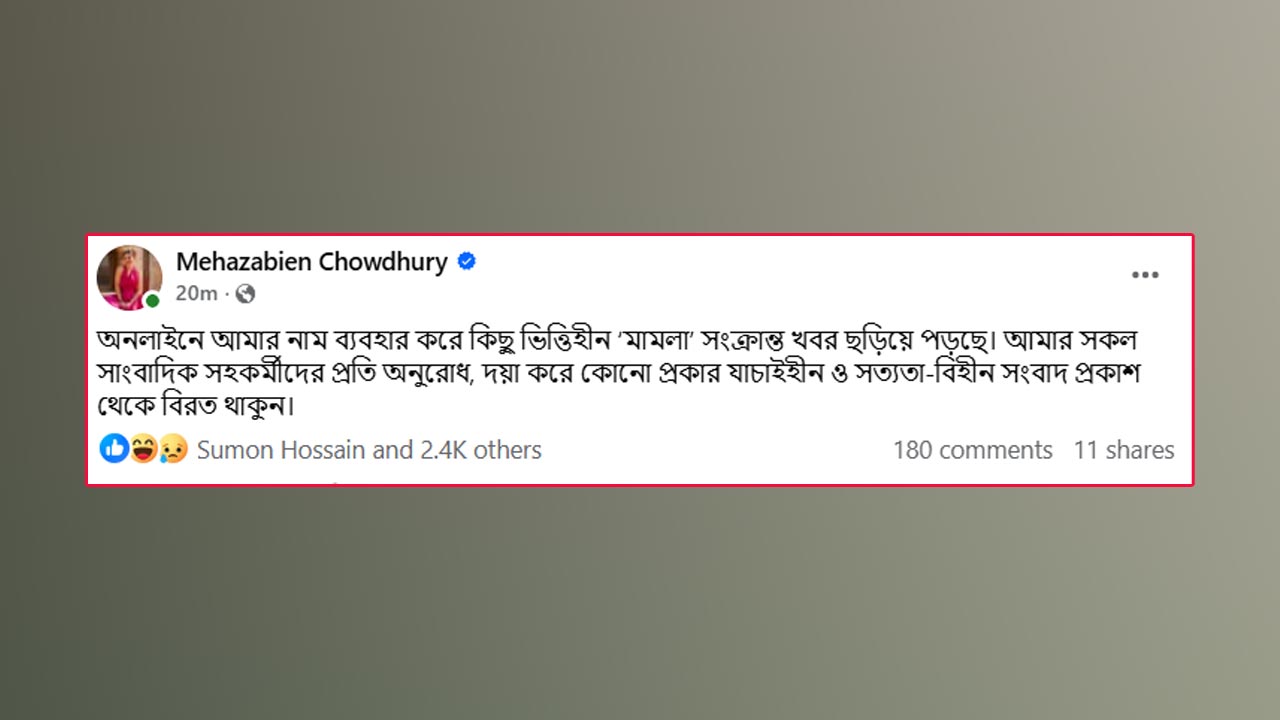 রোববার (১৬ নভেম্বর) অভিনেত্রী তার ফেসবুকে এক পোস্টে লেখেন, ‘অনলাইনে আমার নাম ব্যবহার করে কিছু ভিত্তিহীন ‘মামলা’ সংক্রান্ত খবর ছড়িয়ে পড়ছে। আমার সকল সাংবাদিক সহকর্মীদের প্রতি অনুরোধ, দয়া করে কোনো প্রকার যাচাইহীন ও সত্যতা-বিহীন সংবাদ প্রকাশ থেকে বিরত থাকুন।’