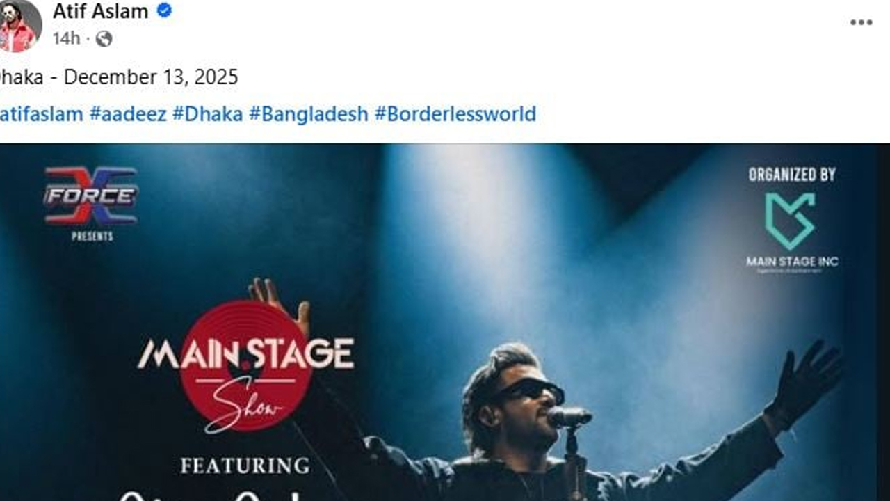 বুধবার (১৯ নভেম্বর) প্রকাশিত পোস্টে মঞ্চে পারফর্ম করার একটি ছবি শেয়ার করে আতিফ লিখেছেন, ‘১৩ ডিসেম্বর ২০২৫, ঢাকায়।’