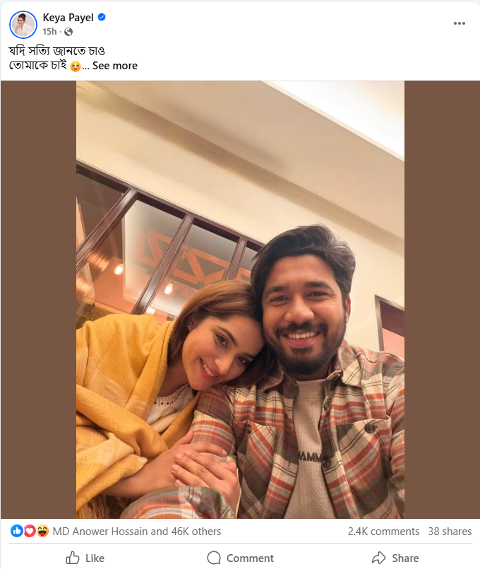 নিজের ভেরিফায়েড সামাজিক যোগাযোগ মাধ্যমে ফেসবুকে খায়রুল বাসারের সঙ্গে একটি ছবি শেয়ার করেছেন কেয়া পায়েল। ছবিতে দুজনকেই দেখা যায় হাসিখুশি ও স্বাচ্ছন্দ্যপূর্ণ মেজাজে। তবে ছবির চেয়েও বেশি আলোচনার জন্ম দিয়েছে এর ক্যাপশন। কেয়া পায়েল সেখানে লিখেছেন, ‘যদি সত্যি জানতে চাও, তোমাকে চাই।’ এই একটি লাইনেই নেটিজেনদের মধ্যে শুরু হয়েছে নানা প্রশ্ন আর কৌতূহল।