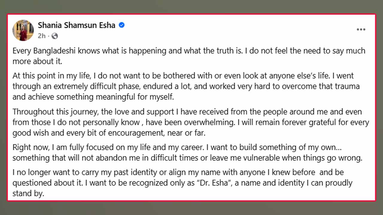 আমি আর আমার অতীত পরিচয় বহন করতে চাই না, কিংবা আগে যাকে চিনতাম তার সঙ্গে নিজের নাম জড়িয়ে প্রশ্নের মুখে পড়তে চাই না। আমি চাই আমার পরিচয় হোক শুধু একটাই “ডা. এশা” একটি নাম, একটি পরিচয়—যার পাশে আমি গর্বের সঙ্গে দাঁড়াতে পারি।’