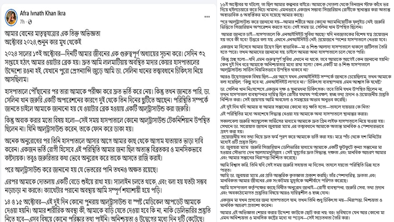 ‘আমার বোনের মাতৃত্বযাত্রার এক তিক্ত অভিজ্ঞতা অক্টোবর ২০২৪,শুনুন কার মুখ থেকেই ২০২৪ সালের ১৩ই অক্টোবর—দিনটি আমার জীবনের এক গুরুত্বপূর্ণ অধ্যায়ের সূচনা করে। সেদিন ৩২ সপ্তাহে হঠাৎ আমার ওয়াটার ব্রেক হয়। দ্রুত আমি লালমাটিয়ায় অবস্থিত মাদার কেয়ার হাসপাতালের উদ্দেশ্যে রওনা হই, যেখানে পুরো প্রেগন্যান্সি জুড়ে আমি ডা. সেলিনা খানের তত্ত্বাবধানে চিকিৎসা নিয়ে আসছিলাম।