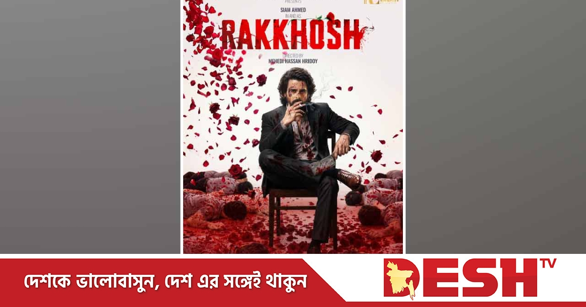 একটি চেয়ারে বসে আছেন সিয়াম আহমেদ। পায়ের ওপর পা তোলা, ঠোঁটে সিগারেট, বা হাতে রক্তমাখা চাপাতি। তার মুখ, জামায় রক্তে ভরা। চেয়ারের চারপাশে অনেকগুলো মরদেহ। তাদের ওপরে গোলাপের বৃষ্টি পড়ছে। সিয়ামের মাথার ওপরে লাল রঙে ‘রাক্ষস’-এর টাইটেল লোগো। এমনটা দেখা গেছে এবারের ঈদের আকাঙ্ক্ষিত ছবি ‘রাক্ষস’-এর প্রথম পোস্টারে।