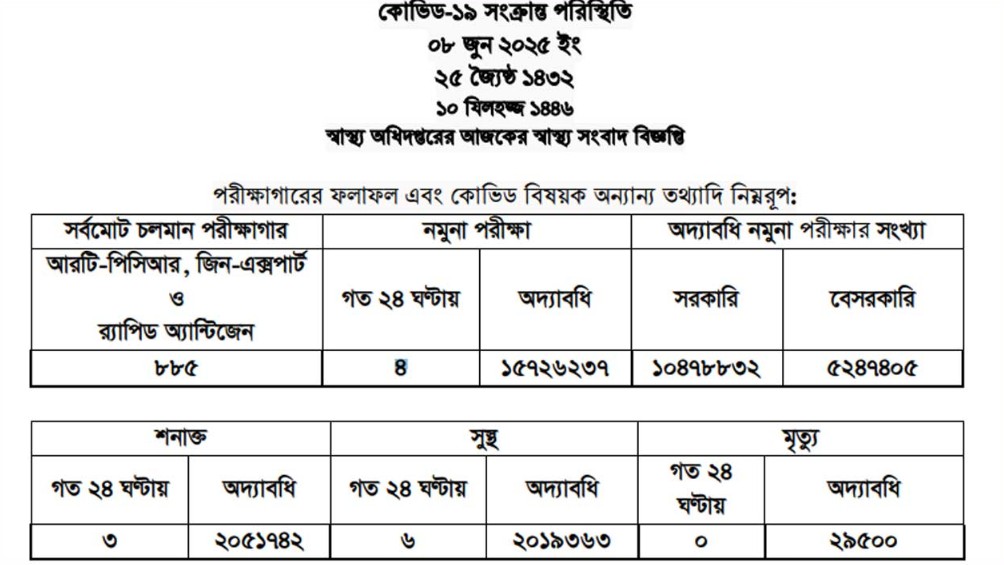 রোববার (৮ জুন) স্বাস্থ্য অধিদপ্তর থেকে পাঠানো করোনা বিষয়ক নিয়মিত সংবাদ বিজ্ঞপ্তিতে এ তথ্য জানানো হয়েছে।
