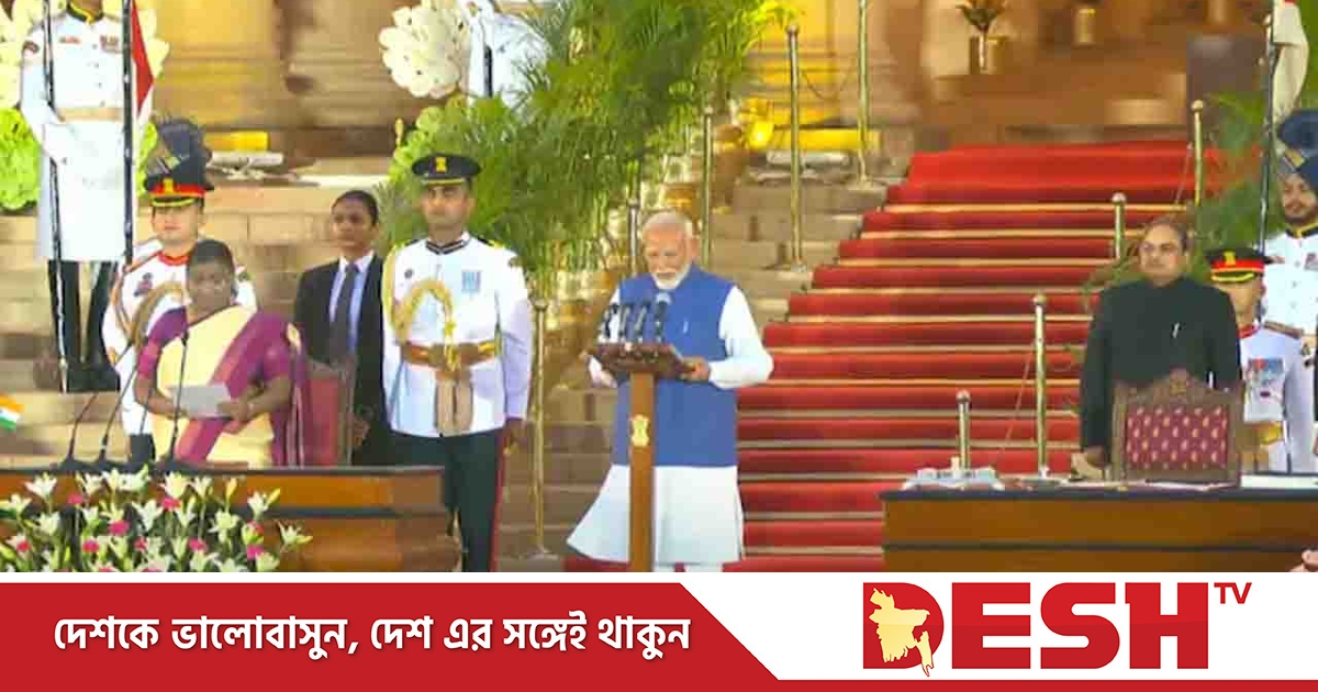 ভারতের প্রধানমন্ত্রী হিসেবে টানা তৃতীয় মেয়াদে শপথ নিয়েছেন নরেন্দ্র মোদি। দেশটির স্থানীয় সময় রোববার (৯ জুন) সন্ধ্যা ৭টা ১৫ মিনিটে নয়াদিল্লিতে রাষ্ট্রপতি ভবনের আঙিনায় এই শপথ অনুষ্ঠান হয়। নরেন্দ্র মোদিকে শপথ পড়ান ভারতের রাষ্ট্রপতি দৌপদী মুর্মু। খবর এনডিটিভির।