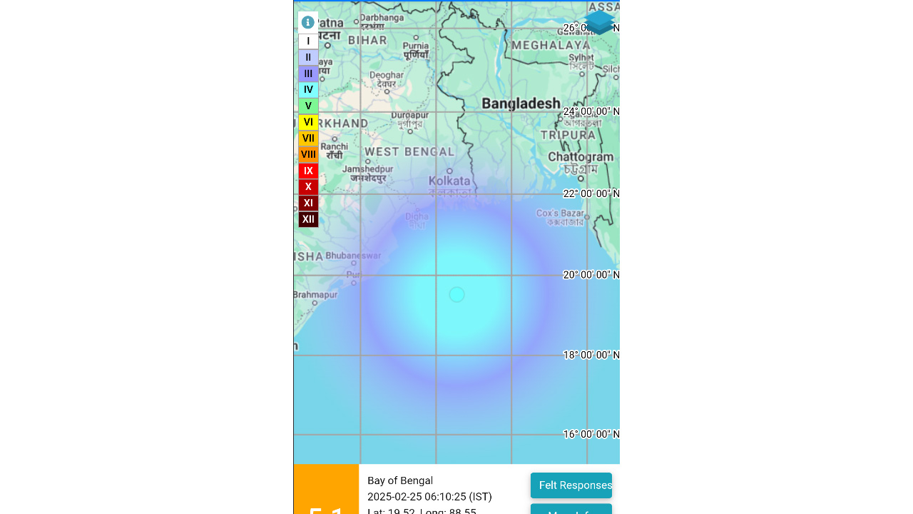 লাইভ মিন্ট বলছে, মঙ্গলবার সকালে কলকাতায় রিখটার স্কেলে ৫.১ মাত্রার ভূমিকম্প আঘাত হেনেছে। ভূমিকম্পের কেন্দ্রস্থল ছিল বঙ্গোপসাগর এবং ভূপৃষ্ঠের ৯১ কিলোমিটার গভীরে। কলকাতার কাছে ভূমিকম্পের বিষয়টি নিশ্চিত করেছে ভারতের জাতীয় ভূকম্পন কেন্দ্র ন্যাশনাল সেন্টার ফর সিসমোলজি।