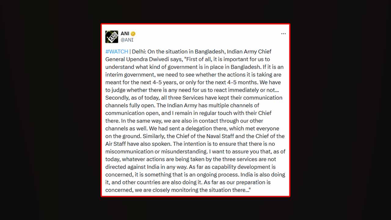 বাংলাদেশের বর্তমান পরিস্থিতি নিয়ে ভারতের অবস্থান ব্যাখ্যা করেছেন দেশটির সেনাপ্রধান জেনারেল উপেন্দ্র দ্বিবেদী। তিনি বলেছেন, প্রথমেই আমাদের বোঝা জরুরি, বাংলাদেশে কী ধরনের সরকার ক্ষমতায় রয়েছে। যদি তা অন্তর্বর্তী সরকার হয়, তাহলে দেখতে হবে তারা যে পদক্ষেপগুলো নিচ্ছে, সেগুলো আগামী ৪-৫ বছরের জন্য নাকি শুধু পরবর্তী ৪-৫ মাসের জন্য। সেই অনুযায়ী আমাদের তাৎক্ষণিক কোনও প্রতিক্রিয়া প্রয়োজন আছে কি না, তা বিচার করতে হবে।