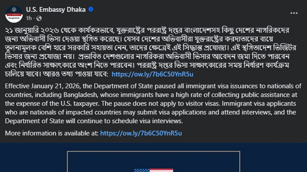 বাংলাদেশসহ নির্দিষ্ট কিছু দেশের নাগরিকদের জন্য অভিবাসী ভিসা প্রদান স্থগিত করার ঘোষণা দিয়েছে যুক্তরাষ্ট্রের পররাষ্ট্র দপ্তর। গত ২১ জানুয়ারি ২০২৬ থেকে এই সিদ্ধান্ত কার্যকর করা হয়েছে।