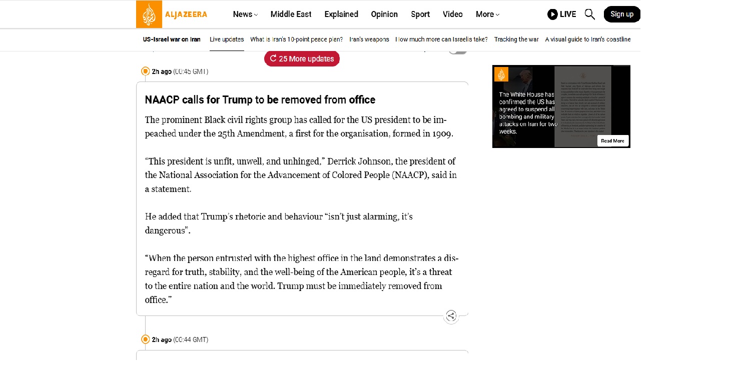 কৃষ্ণাঙ্গদের অধিকার রক্ষায় কাজ করা মার্কিন যুক্তরাষ্ট্রের ঐতিহ্যবাহী সংগঠন ন্যাশনাল অ্যাসোসিয়েশন ফর দ্য অ্যাডভান্সমেন্ট অব কালারড পিপল (এনএএসিপি) প্রেসিডেন্ট ডোনাল্ড ট্রাম্পকে অবিলম্বে ক্ষমতাচ্যুত করার আহ্বান জানিয়েছে।