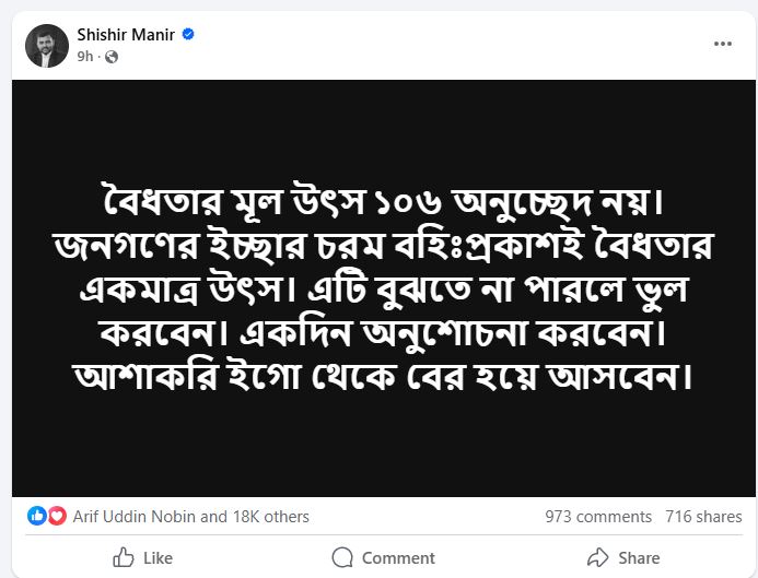 পোস্টে তিনি লিখেছেন- বৈধতার মূল উৎস ১০৬ অনুচ্ছেদ নয়। জনগণের ইচ্ছার চরম বহিঃপ্রকাশই বৈধতার একমাত্র উৎস। এটি বুঝতে না পারলে ভুল করবেন। একদিন অনুশোচনা করবেন। আশাকরি ইগো থেকে বের হয়ে আসবেন।