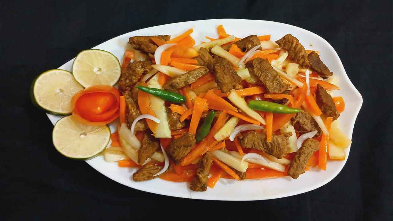 গরুর মাংস ৩০০ গ্রাম জুলিয়ান কাট করা, আদা রসুন বাটা এক চা চামচ, গোল মরিচ গুঁড়া হাফ চা চামচ, সয়া সস এক চা চামচ, পেঁয়াজ কুচি ২ চা চামচ, শসা জুলিয়ান কাট এক কাপ, কাঁচামরিচ চার থেকে পাঁচটি, লবণ স্বাদমতো, অলিভ অয়েল ২ চামচ, ওয়েস্টার সস হাফ চা চামচ, লেবুর রস এক টেবিল চামচ,পানি দুই কাপ।