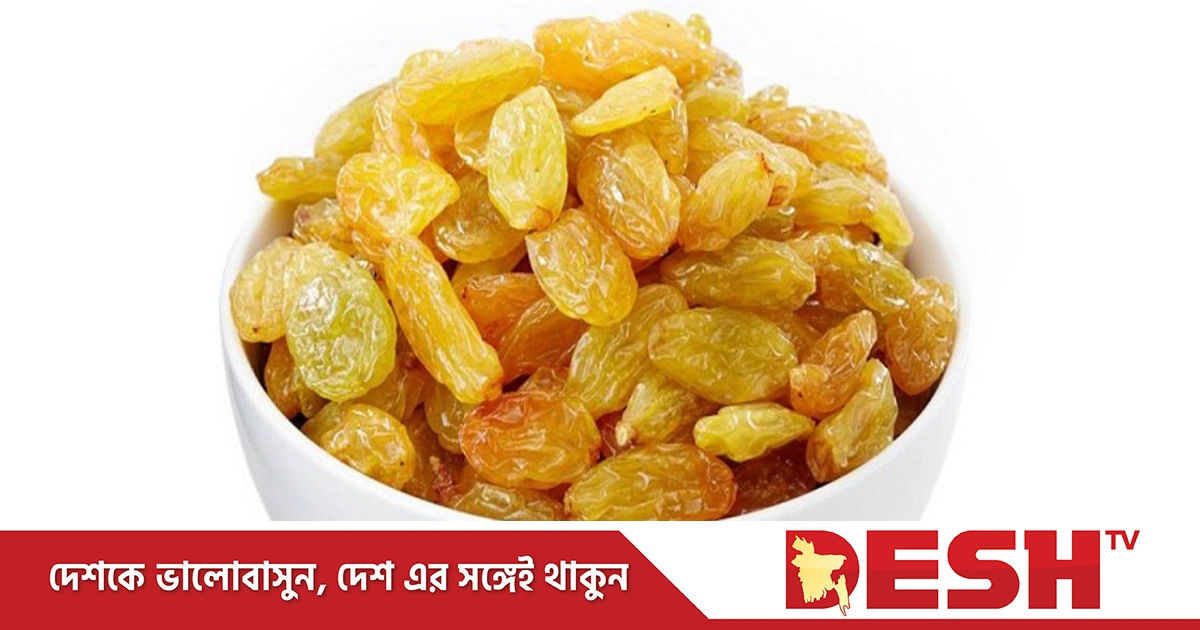 পুষ্টিবিদরা বলছেন, শুকনো এ ফলটিই ত্বকের শুষ্কতা ঘোচাতে দারুণ কাজ করে। কালো, সোনালি ও বাদামি রঙের চুপসানো ভাঁজ হওয়া ফলটি খুবই শক্তিদায়ক। এটি তৈরি করা হয় সূর্যের তাপে। এটি রক্তে শর্করার মাত্রায় ঝামেলা তৈরি করে না। এটি খেলে শরীরের রক্ত দ্রুত বৃদ্ধি পায়, পিত্ত ও বায়ুর সমস্যা দূর হয়। এটি হৃৎপিণ্ডের জন্যও অনেক উপকারী। ১. ওজন নিয়ন্ত্রণ: কিশমিশ প্রাকৃতিক শর্করা সমৃদ্ধ এবং শরীরে বাড়তি ক্যালরি যোগ করা ছাড়াই ক্ষুধা নিয়ন্ত্রণে রাখে। তাই দীর্ঘক্ষণ পেট ভরা রাখার পাশাপাশি ওজন নিয়ন্ত্রণে রাখতে সহায়তা করে এটি। ২. রক্তস্বল্পতা দূর: প্রচুর পরিমাণে লৌহ ও ভিটামিন বি কমপ্লেক্স সমৃদ্ধ কিশমিশ রক্তস্বল্পতা সমস্যা দূর করতে সাহায্য করে। এতে থাকা কপার রক্তের লোহিত কণার পরিমাণ বাড়ায়। ৩. হজমে সহায়তা: কিশমিশ আঁশ সমৃদ্ধ তাই পানিতে ভিজিয়ে রাখার কারণে এটা প্রাকৃতিক রেচক হিসেবে কাজ করে। ভেজানো কিশমিশ হজমের সমস্যা উন্নত করে কোষ্ঠকাঠিন্যের সমস্যা কমায় এবং পেট পরিষ্কার রাখে। ৪. রক্তচাপ নিয়ন্ত্রণ: কিশমিশ পটাশিয়াম সমৃদ্ধ, যা শরীরের লবণাক্ততার ভারসাম্য বজায় রাখে ও রক্তচাপ নিয়ন্ত্রণে সহায়তা করে। এটা অ্যান্টি অক্সিডেন্ট খাদ্যাশেরও ভালো উৎস যা রক্তনালির জৈব রসায়নে ইতিবাচক পরিবর্তন আনে। ফলে রক্তচাপ হ্রাস পেতে পারে। ৫. হাড়ের সুরক্ষা: বোরন হাড় গঠনের জন্য প্রয়োজন, যা কিশমিশে প্রচুর পরিমাণে থাকে। এতে আরও রয়েছে ক্যালসিয়াম ও মাইক্রোনিউট্রিয়েন্ট। প্রতিদিন ভেজা কিশমিশ খাওয়া হাড় সুস্থ ও সুদৃঢ় রাখতে সাহায্য করে। ৬. মুখের দুর্গন্ধ দূর: কিশমিশে আছে অ্যান্টি ব্যাক্টেরিয়াল উপাদান, যা মুখের স্বাস্থ্য রক্ষায় ও দুর্গন্ধ দূর করতে সাহায্য করে। ৭. রোগ প্রতিরোধক্ষমতা বৃদ্ধি: কিশমিশ ভিটামিন বি এবং সি সমৃদ্ধ। তাই এই শুকনো ফলটি রোগ প্রতিরোধক্ষমতা বাড়ায় এবং সম্ভাব্য সংক্রমণের ঝুঁকি কমায়। এর প্রদাহনাশক উপাদান জ্বর, সংক্রমণ ও অন্যান্য দুর্বলতা থেকে সুরক্ষিত রাখতে সাহায্য করে। ৮. শক্তি জোগায়: কিশমিশে থাকা প্রাকৃতিক গ্লুকোজ কর্মশক্তি বাড়ায়। পরিমিত কিশমিশ খাওয়া দুর্বলভাব কমায় ও ওজন নিয়ন্ত্রণে রাখে। ৯. অন্ধত্ব ও কোলেস্ট্রেরল দূর: কিশমিশে আছে প্রচুর পরিমাণে অ্যান্টি অক্সিডেন্ট, যা অন্ধত্ব প্রতিরোধ করে। কিশমিশের দ্রবণীয় ফাইবার লিভার থেকে কোলেস্টেরল দূর করতে সাহায্য করে। ১০. অনিদ্রা: কিশমিশে রয়েছে প্রচুর আয়রন, যা মানুষের অনিদ্রার সমস্যা দূর করতে সহায়ক। তাই প্রতিদিনই সকালে খালি পেটে ২টি করে কিশমিশ খাওয়ার অভ্যাস করতে পারেন।