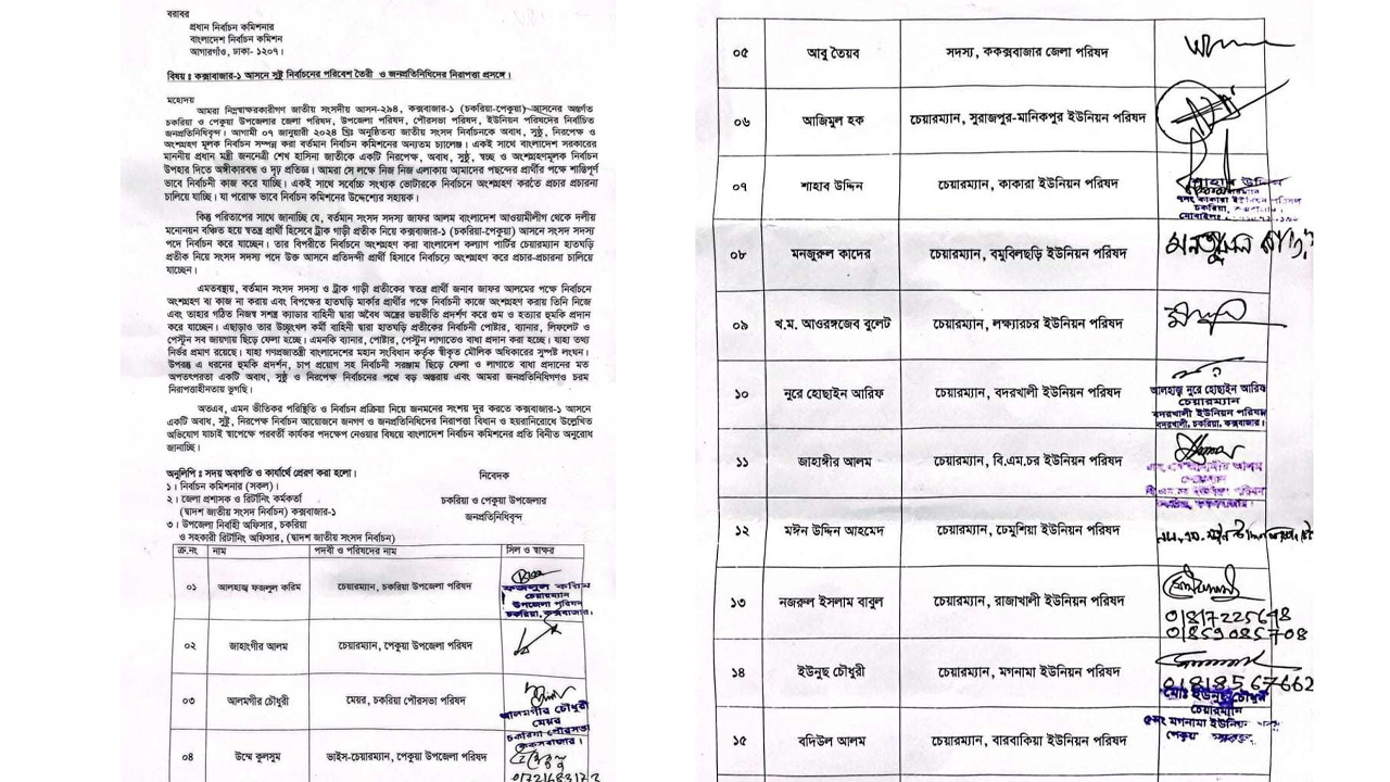 নিজেদের নিরাপত্তা চেয়ে এবং কক্সবাজার-১ (চকরিয়া-পেকুয়া) আসনে নির্বাচনের সুষ্ঠু পরিবেশ তৈরির জন্য প্রধান নির্বাচন কমিশনারের (সিইসি) কাছে আবেদন করেছেন চকরিয়া ও পেকুয়া উপজেলার ১৫ জনপ্রতিনিধি।