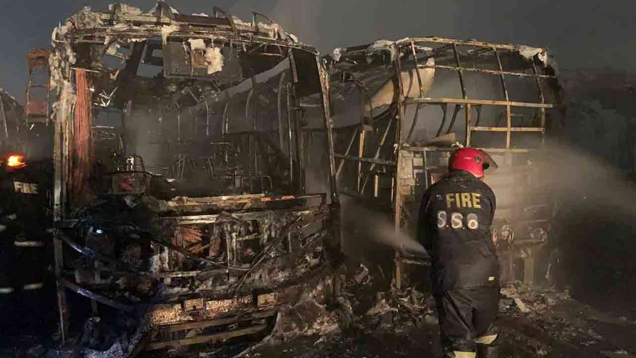 রাজধানীর ডেমরা কোনাপাড়ার ধার্মিক পাড়া এলাকায় গ্যারেজে থাকা লন্ডন এক্সপ্রেসের (ভলভো কোচ) ১৪টি বাস ভয়াবহ অগ্নিকাণ্ডে পুড়ে গেছে।