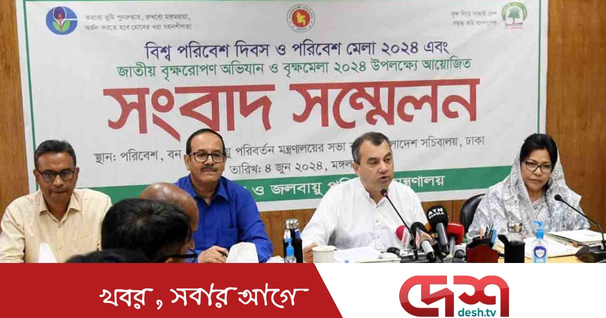 মঙ্গলবার (৪ জুন) 'করবো ভূমি পুনরুদ্ধার, রুখবো মরুময়তা; অর্জন করতে হবে মোদের খরা সহনশীলতা' প্রতিপাদ্যে বিশ্ব পরিবেশ দিবস ও পরিবেশ মেলা এবং 'বৃক্ষ দিয়ে সাজাই দেশ, সমৃদ্ধ করি বাংলাদেশ' প্রতিপাদ্যে জাতীয় বৃক্ষরোপণ অভিযান ও বৃক্ষমেলা ২০২৪ উপলক্ষে মন্ত্রণালয়ের সভাকক্ষে আয়োজিত সংবাদ সম্মেলনে পরিবেশমন্ত্রী এসব কথা জানান।