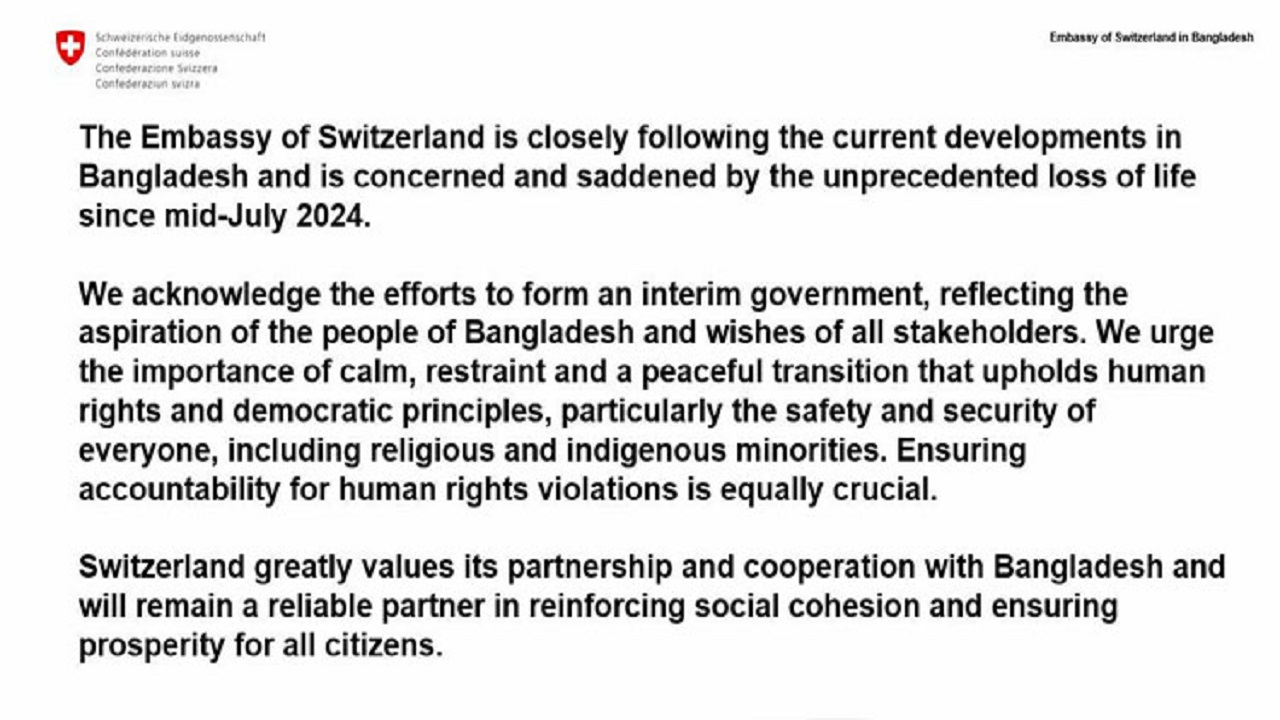 বাংলাদেশের জনগণের আকাঙ্ক্ষা এবং সংশ্লিষ্টদের ইচ্ছার প্রতিফলন করে একটি অন্তর্বর্তী সরকার গঠনের প্রচেষ্টাকে স্বাগত জানিয়েছে সুইজারল্যান্ড। দেশটির ঢাকার দূতাবাস বাংলাদেশের বর্তমান উন্নয়ন ঘনিষ্ঠভাবে পর্যবেক্ষণ করছে। এছাড়া চলতি বছরের জুলাইয়ের মাঝামাঝি থেকে অভূতপূর্ব প্রাণহানির কারণে উদ্বিগ্ন ও দুঃখ প্রকাশ করেছে।