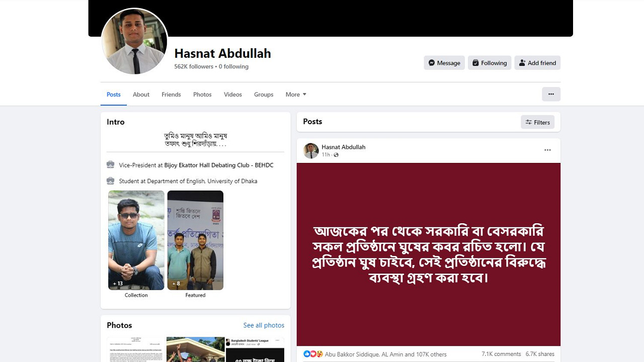 তারই ধারাবাহিকতায় শনিবার রাতে ফেসবুকে স্ট্যাটাস দিয়ে ঘুষের বিরেুদ্ধে অবস্থান নেওয়ার কথা জানিয়েছেন আন্দোলনের সমন্বয়ক হাসনাত আব্দুল্লাহ।