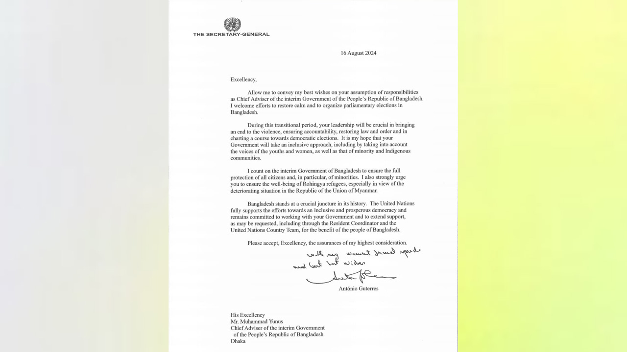 অন্তর্বর্তী সরকারের প্রধান উপদেষ্টা অধ্যাপক ড. মুহাম্মদ ইউনূসকে লেখা এক চিঠিতে জাতিসংঘ মহাসচিব আন্তোনিও গুতেরেস একথা বলেছেন।