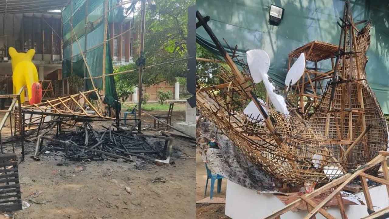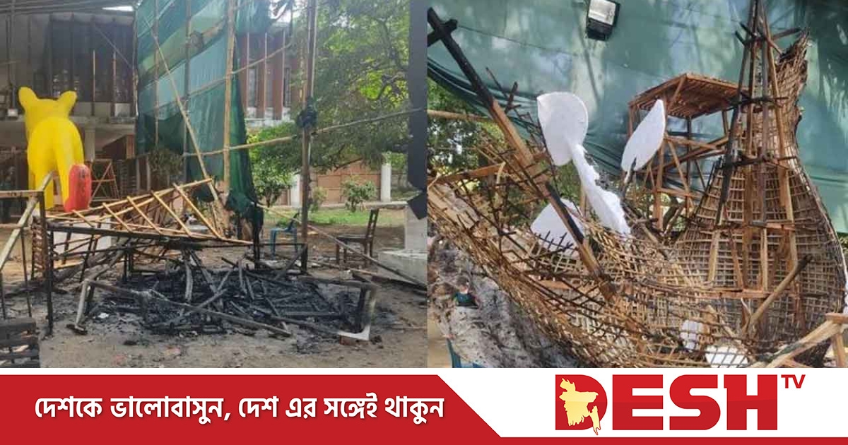 পরিতাপের সাথে জানাচ্ছি যে, আজ শনিবার ভোর আনুমানিক ৪টা ৫০ মিনিট এর সময় অনুষদের দক্ষিণ পার্শ্বের গেট সংলগ্ন এলাকায় প্যান্ডেলের ভিতরে থাকা শোভাযাত্রার জন্য নির্মিত বিভিন্ন ধরণের প্রতীকী মোটিফের মধ্যে ফ্যাসিস্টের প্রতীকী মোটিফ কে বা কাহারা আগুন দিয়ে পুড়িয়ে ফেলে।