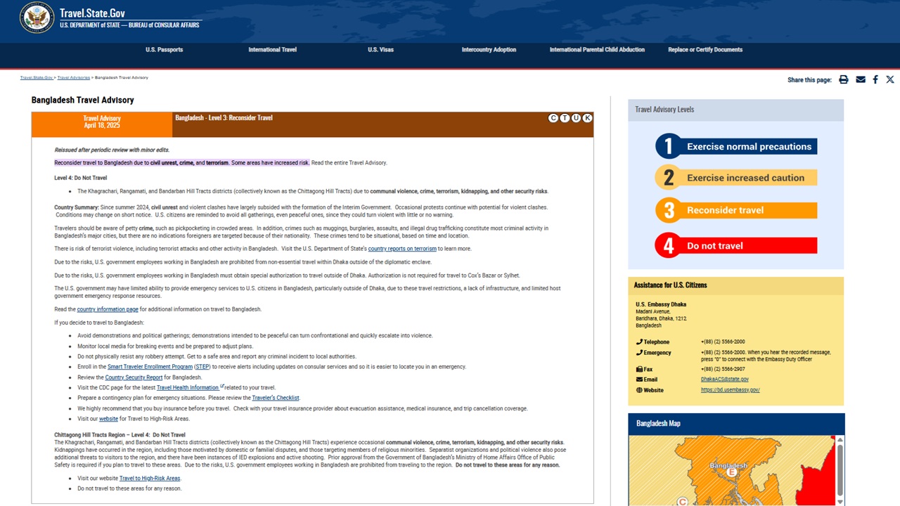 বাংলাদেশে ভ্রমণের ক্ষেত্রে নিজ দেশের নাগরিকদের জন্য তৃতীয় ধাপের (পুনর্বিবেচনা) সতর্কতা জারি করেছে যুক্তরাষ্ট্র। এ ছাড়া বাংলাদেশে অবস্থানরত মার্কিন নাগরিকদের জন্য পার্বত্য চট্টগ্রাম এলাকা ভ্রমণে চতুর্থ ধাপের সতর্কতা (ভ্রমণ নিষিদ্ধ) ঘোষণা করেছে দেশটি।